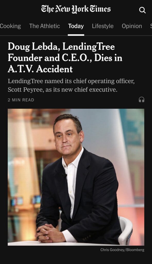 Yesterday, I saw this NYTimes story about LendingTree’s CEO sudden and accidental death.